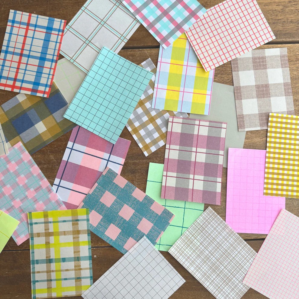 さまざまな幅や色の線をかけ合わせたチェック柄がセットになっています。